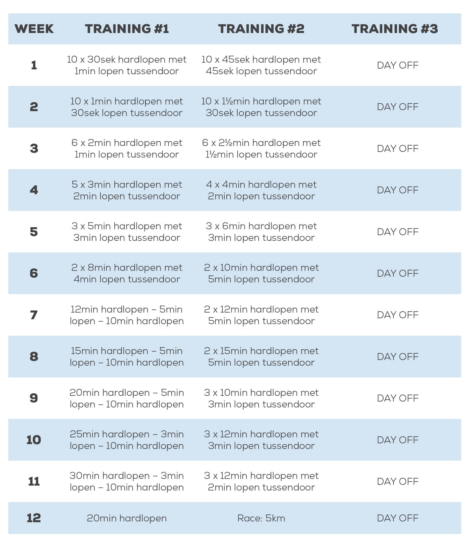 Het beste hardloopschema voor beginners. 2 Volume en intensiteit van de trainingen mogen maximum 10 per week toenemen. Bij het trainingsschema halve marathon gaan wij uit van een 12-weeks hardloopschema.